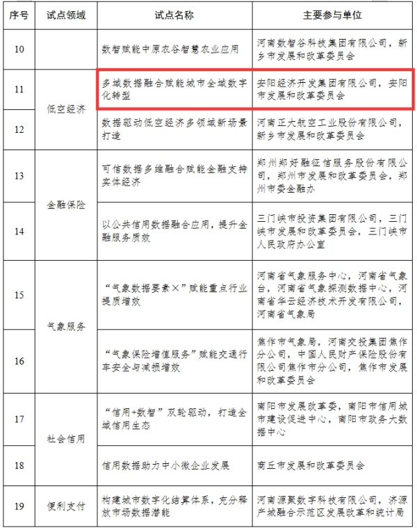 近日,河南省發(fā)展和改革委員會發(fā)布《關于印發(fā)首批河南省重點領域數(shù)據(jù)資源開發(fā)利用試點名單的通知》,集團下屬經開信息化公司申報的“多域數(shù)據(jù)融合賦能城市全域數(shù)字化轉型”(低空經濟領域)項目成功入選全省首批數(shù)據(jù)資源開發(fā)利用試點。